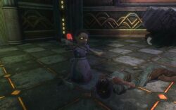 ― A Little Sister as she starts to harvest an ADAM corpse in BioShock 2.[src]